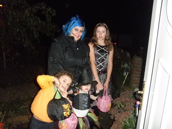 Vcera vecer jsem byla s detma na trick or treat, obesli jsme baracky tady u nas, bylo to tak na pul hodky, protoze decek bylo venku docela dost,takze obcas dochazelo ke stretum,kdo bude mit prvni sladkost v kosicku :D Oblekla jsem Poppi jako malou carodejku, Toby mel svuj pumpkin kostym a Elise mela svuj kostym 'netopyrky' :)